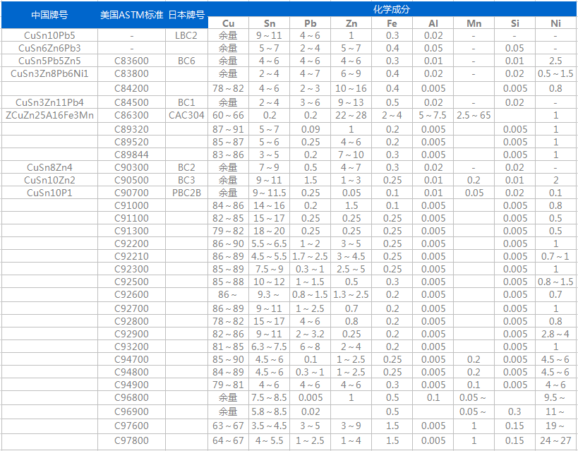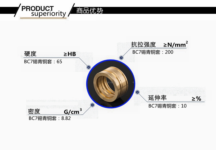 BC7鑄造錫青銅有中等的強(qiáng)度,良好的耐磨性,易加工等特點(diǎn)。主要應(yīng)用于壓力10MPa,速度2.5m/s條件下工作的軸承、軸套和其它耐磨件。對(duì)應(yīng)國標(biāo)ZCuSn6Zn6Pb3