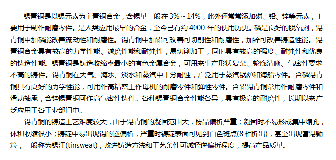 LBC3(CAC603)鑄造錫青銅銅合金潤滑性能、耐磨性能和耐蝕性能好,適合用作雙金屬鑄造材料。如:表面壓力高,又存在側(cè)壓力的滑動軸承,如軋輾、車輛用軸承、負(fù)荷峰值60MPa的受沖擊的零件,以及最高峰值達(dá)100MPa的內(nèi)燃機(jī)雙金屬軸瓦,以及活塞銷套、摩擦片等。對應(yīng)國標(biāo)ZCuPb10Sn10